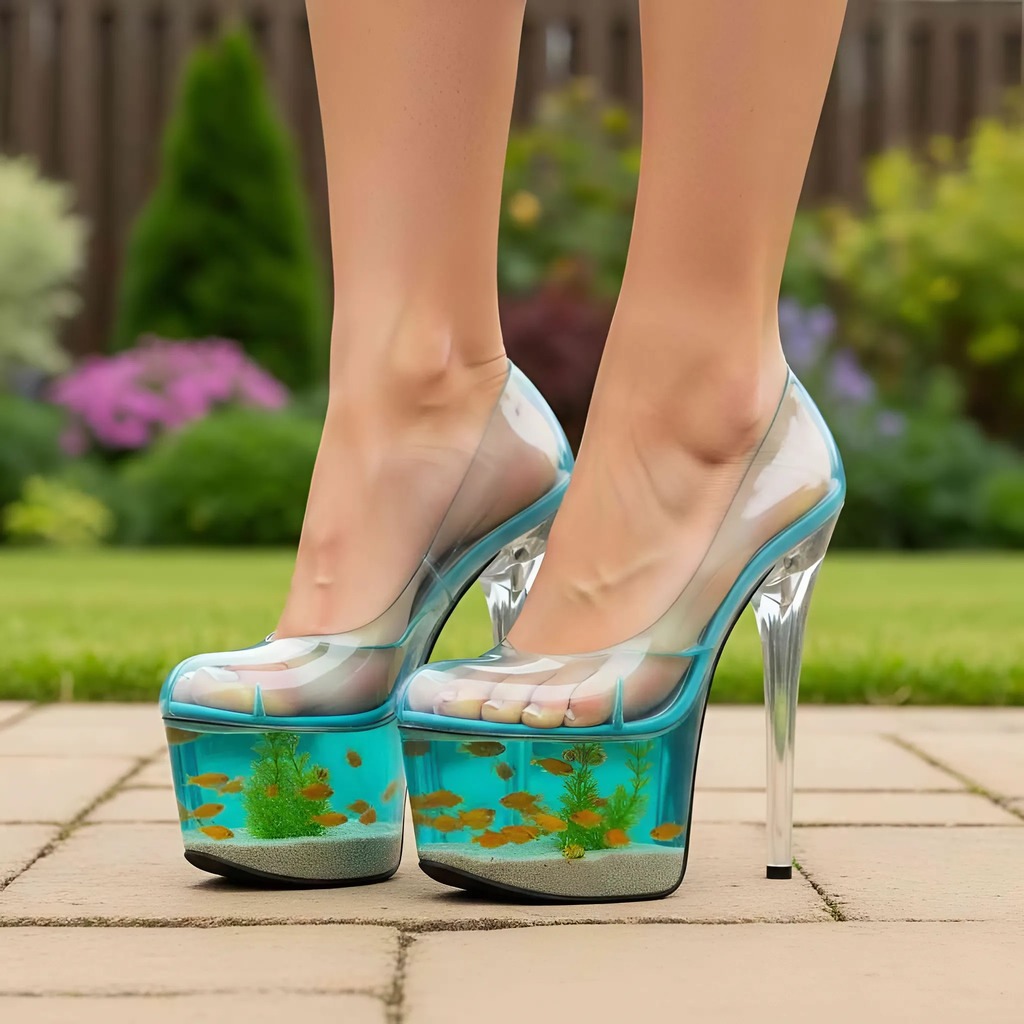The defining feature of aquarium heels is transparency. Clear or translucent materials form the structure of the heel, allowing water, decorative elements, or aquatic imagery to appear suspended inside. This illusion of depth and motion creates a sense of life within the shoe, as though the heel itself were breathing.