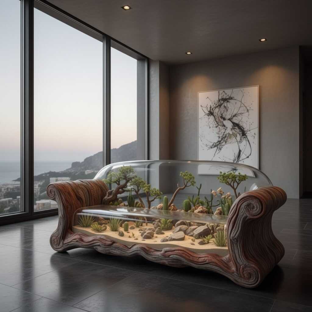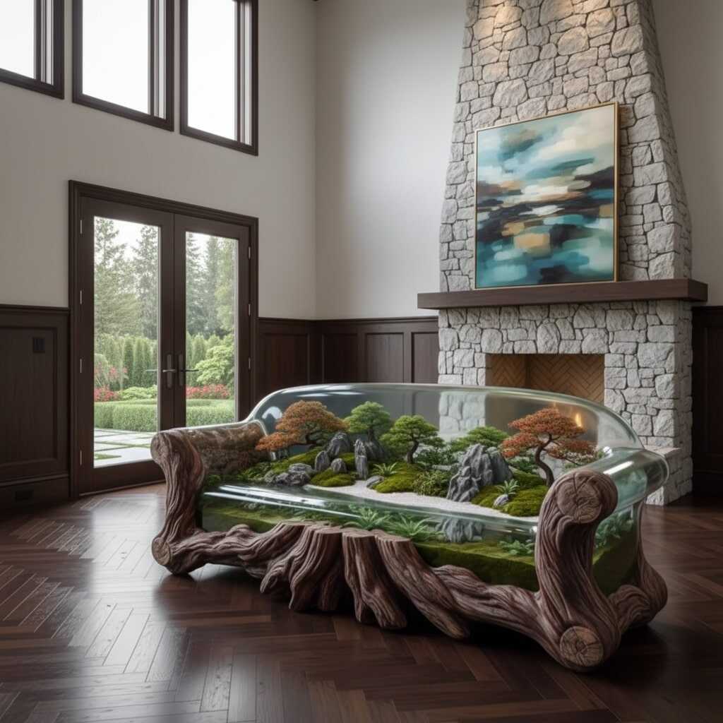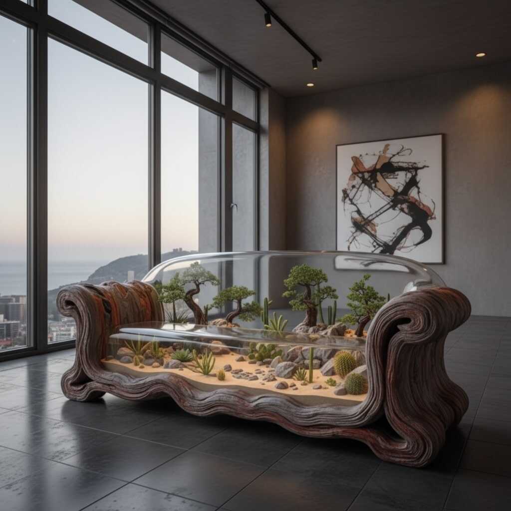The upholstery work comes next. Designers often choose fabrics or cushions that complement the embedded environment. A sofa showcasing a flowing river may feature cool-toned cushions that echo water, while a forest-inspired scene may lean toward warm earth tones. The end result is a seamless blend of traditional comfort and extraordinary epoxy artistry.