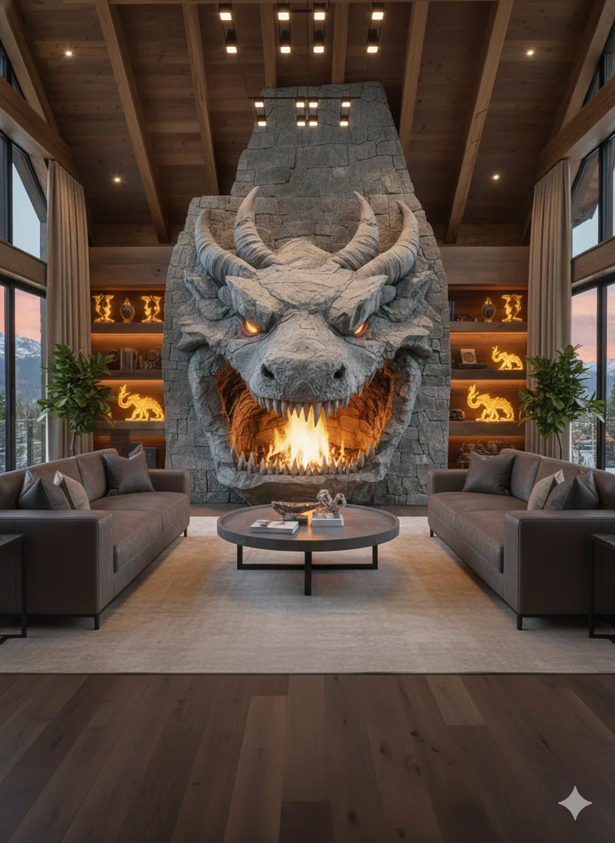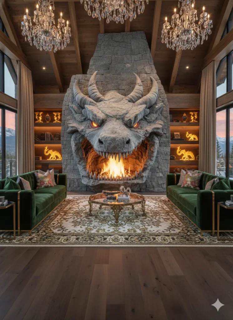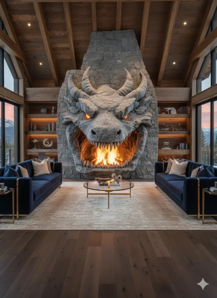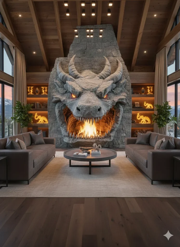 Unlike conventional fireplaces that blend quietly into the background, this design anchors the entire space. Furniture naturally orients toward it, and the room’s energy shifts toward gathering and contemplation. The dragon’s presence adds gravity, making the hearth feel less like a utility and more like a ceremonial center of the home.